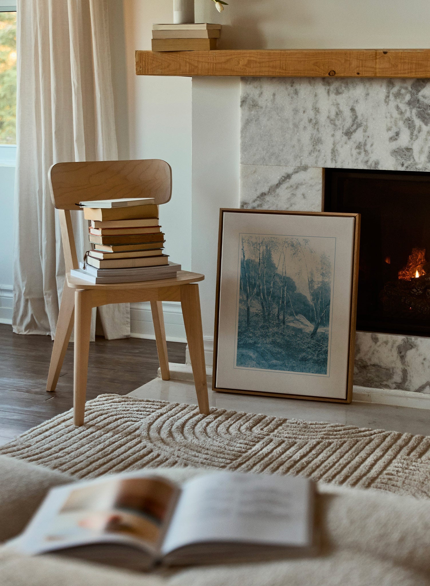 This serene art print captures the quiet elegance of a birch forest rendered in soft, blue tones. The subtle gradient of light and shadow creates depth and dimension, while the minimalist composition invites a sense of calm and introspection. Delicate details in the tree trunks and underbrush add texture to the tranquil scene.