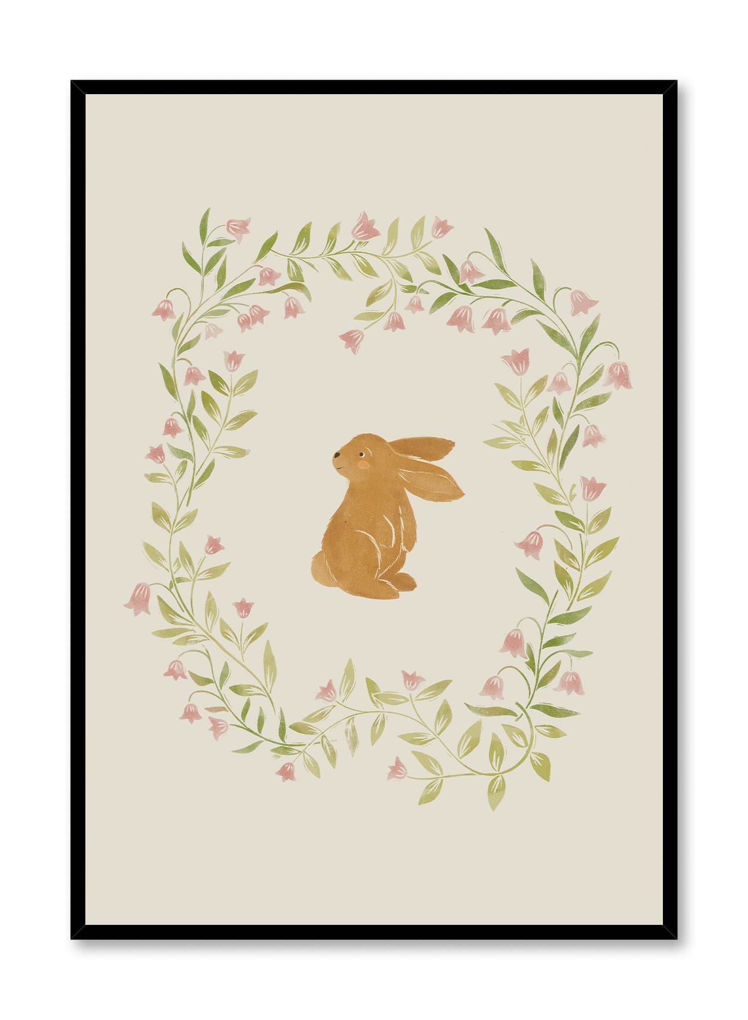 This delightful art print features a curious little bunny seated within a garland of soft pink bellflowers and lush greenery. The bunny’s warm caramel tones contrast gently with the muted cream background, creating a tranquil and whimsical composition. The finely detailed floral wreath adds a touch of natural elegance to the piece.