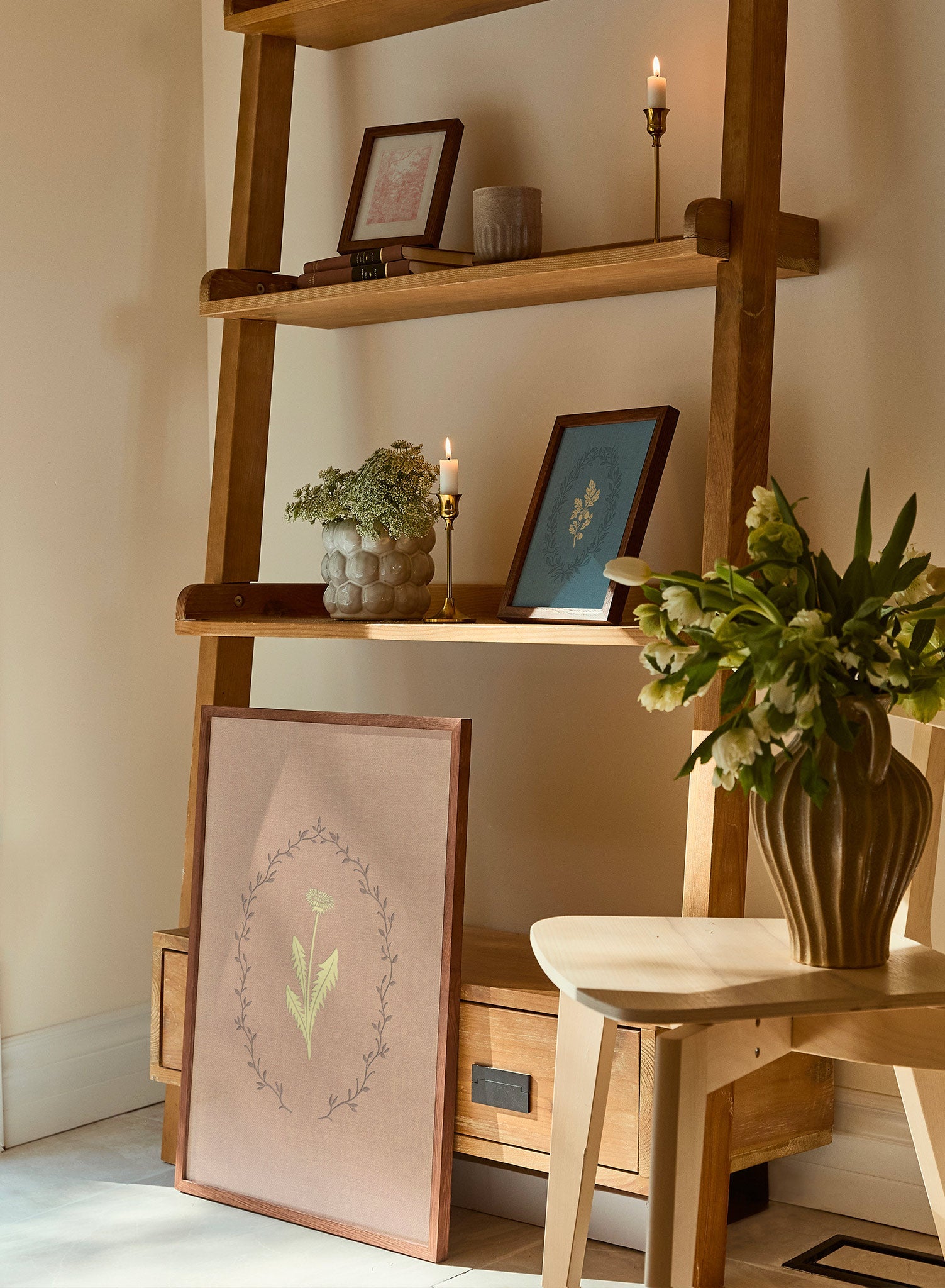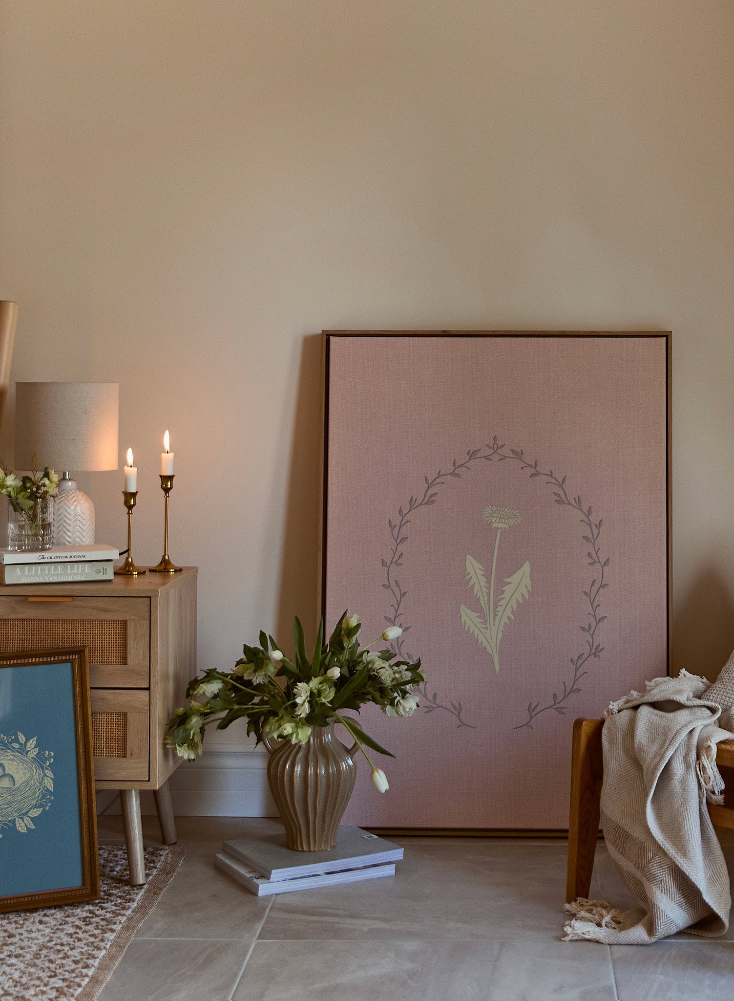 This delicate art print features a softly rendered dandelion framed by an intricate wreath of flowing branches. The muted blush background lends a gentle warmth, while the creamy yellow of the dandelion adds a bright, uplifting touch. The minimal composition feels both airy and serene, making it perfect for creating a calming atmosphere.