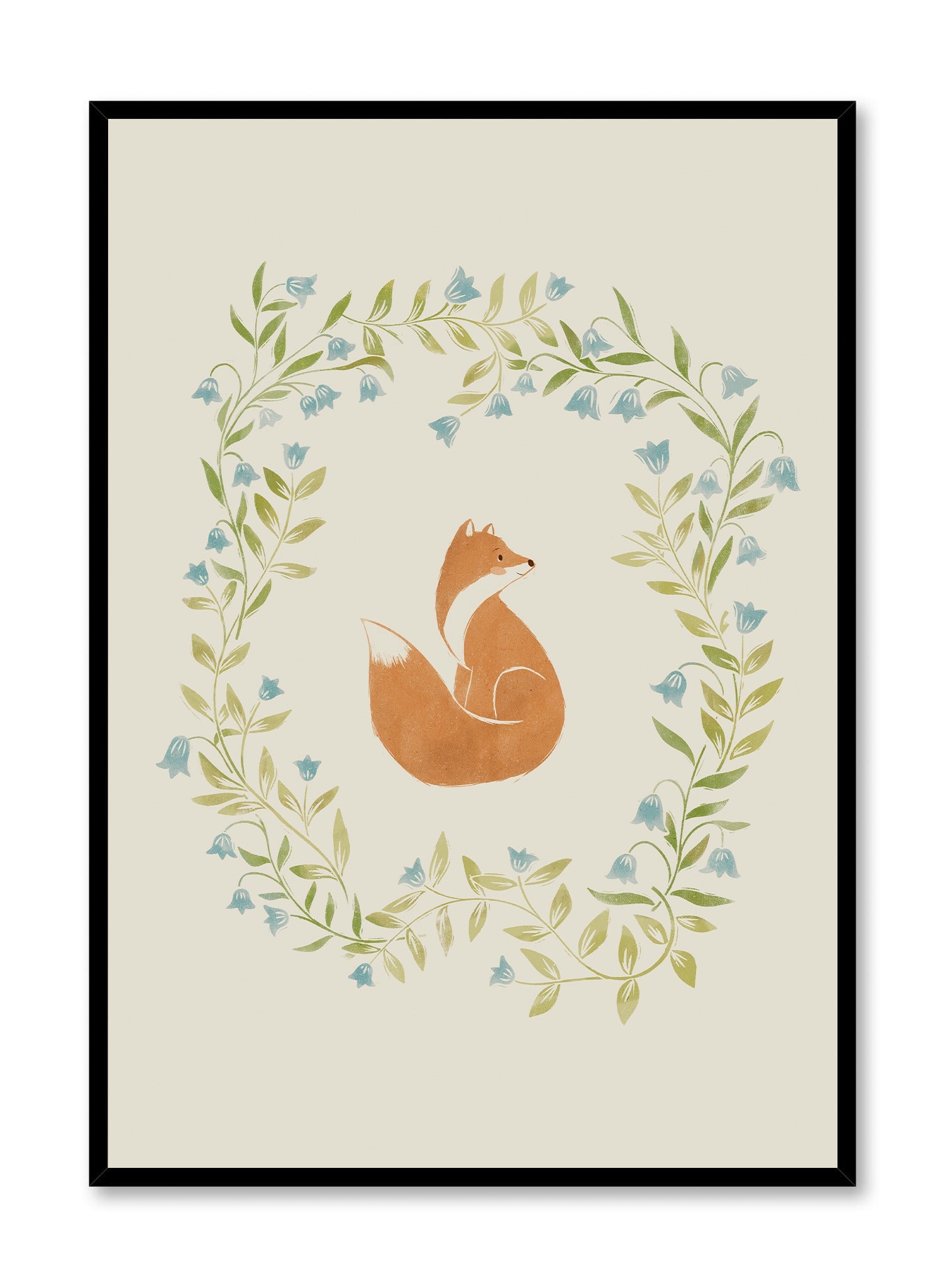 A sleek fox sits gracefully at the heart of this charming art print, encircled by a wreath of bluebells and leafy vines. The fox’s vibrant orange coat pops against the muted cream backdrop, creating a balanced yet eye-catching design. The delicate bluebell blossoms bring an added touch of serenity and seasonal whimsy.