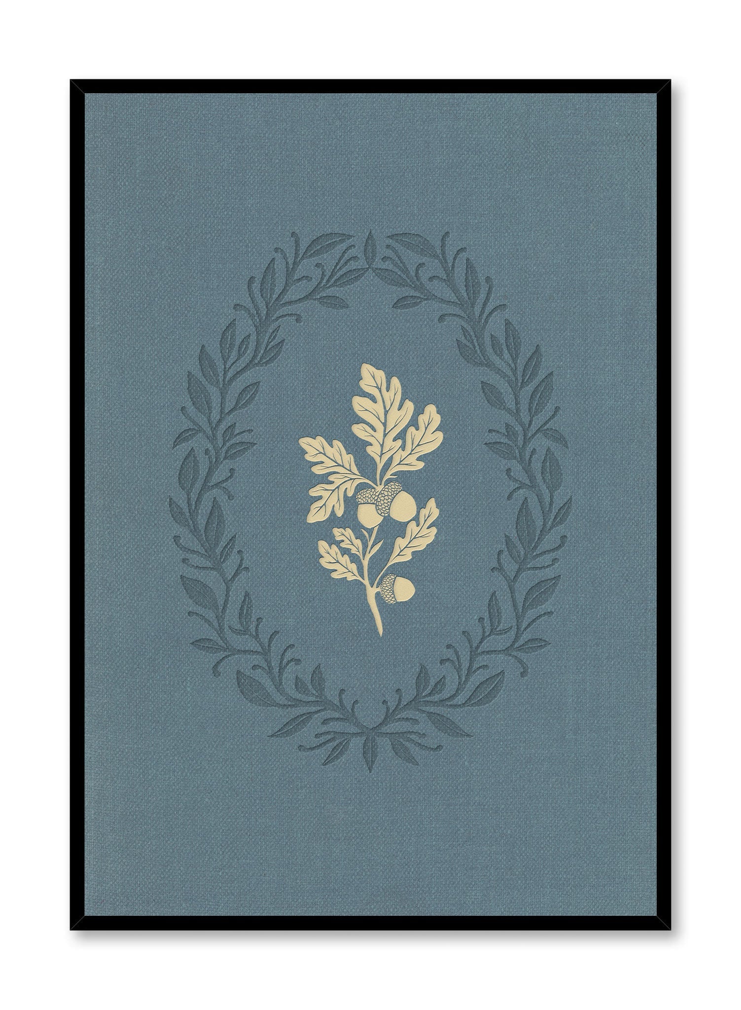 This elegant art print showcases a golden oak branch surrounded by an intricate laurel wreath. Set against a muted teal backdrop, the design combines natural elements with a refined, timeless aesthetic. The soft textures and warm tones make it a versatile piece for a variety of interior styles.